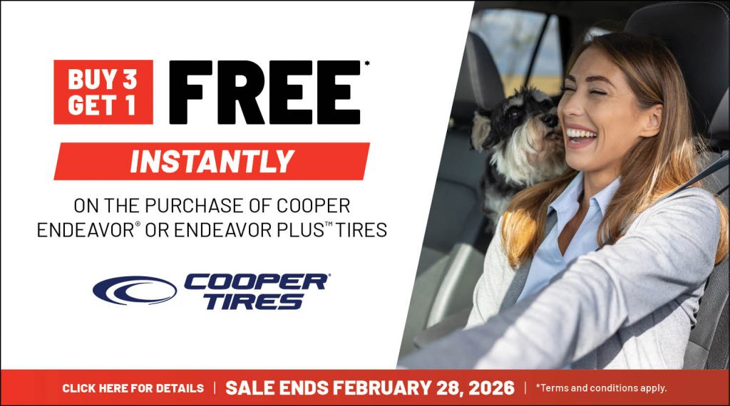 *Savings vary by location and tire. Valid on qualifying purchases from 02/01/26-02/28/26. Instant savings offer (Buy 3 Cooper Tires Get 1 Free) must be completed at time of purchase of select sets of three (3) Cooper tires. Installation is not included. Instant savings offer has no cash value and is non-transferable. Offer subject to availability and may change at any time. Additional taxes and fees may apply. Additional charge for shop supplies may be added. Redeem at participating locations only. Terms and conditions apply. See Store Teammate for further details.